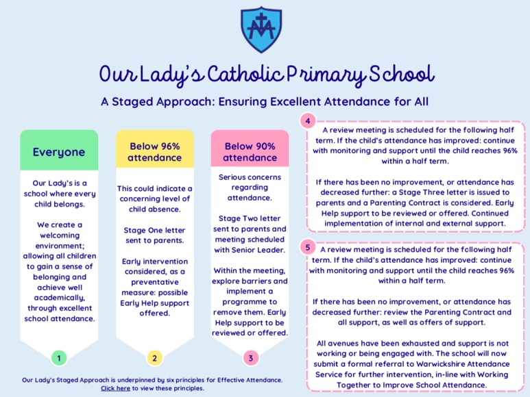 At Our Lady's, we implement a staged approach to promote excellent attendance for every pupil. Our staged approach is underpinned by six principles: